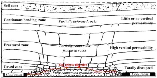 Coal seam gas, held within the inner pores in unmineable coal, is an important energy resource. However, as shown in Figure 1, longwall mining may commonly form four zones of disturbance after disturbing the overlying strata of a coal seam [1]; this makes the coal seam gas within the coal be rapidly released into the gob. Gas releases from coal during mining not only causes engineering accidents (gas outbursts, coal and gas outburst, etc.) [2,3], but also contributes to global warming by the greenhouse effect [4]. The permeability increased by up to three orders of magnitude in the fractured (caved) zone and is usually several orders of magnitude greater than that of the intact coal [5]. Such a high permeability in coal threatens the normal storage and transport of gas within the coal seam [6].