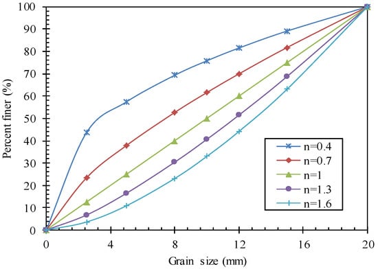 where j is the size range of the granular coal, and its maximum value is 7 according to the sample preparation; D is the largest grain diameter, and D = 20 in this test; dj is the largest grain diameter in the range of j sample; pj is the mass ratio of the size range of the j sample; and n is the control parameter of the grain size distribution (GSD) for the sample, and then the seven granular ranges are mixed by n = 0.4, 0.7, 1, 1.3, and 1.6, respectively. The GSD curve for the five mixtures is shown in Figure 2.