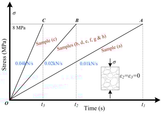 The gas adsorbate used was N2, with a bulk gas density of ρg = 1.16 kg/m3 and kinetic viscosity of μg = 1.76 × 10−5 Pa·s under laboratory conditions (25 °C at 100 kPa). As shown in Figure 3 and Table 1, in Test 1, samples (a, b, and c) were used to monitor the effect of the compressive stress rate on the seepage characteristics; their size mixtures were the same, i.e., n = 1; the stress rate for paths OA, OB, and OC were 0.01 kN/s (sample a), 0.02 kN/s (sample b), and 0.04 kN/s (sample c), respectively, and the corresponding loading times were t1, t2 and t3. According to the in-situ conditions of the Yuheng coal field, the buried depth z of the coal seam is about 320 m, based on , where is the density of overburden strata. Therefore, the compressive stress was set as 8 MPa, where . In Test 2, samples (d, e, f, g, and h) were used to monitor the original GSD effect; their loading paths were the same, i.e., the stress rate was 0.02 kN/s; the original GSD for samples d, e, f, g, and h were n = 0.4, 0.7, 1, 1.3, and 1.6, respectively. The compressive stress of 8 MPa was achieved at .