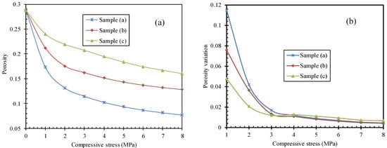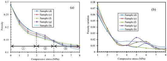 Figure 7b shows that the porosity variation decreases during compression, due to a progressive reduction in void diameter. Four MPa appeared to be the critical compressive stress for porosity variation, and the porosity variation for sample (a) was larger than that for the other samples before the critical compressive stress, which means that the voids in sample (a) were wider than those in the other samples. The porosity variation as well as the void diameter in the three samples was almost the same at the critical compressive stress.