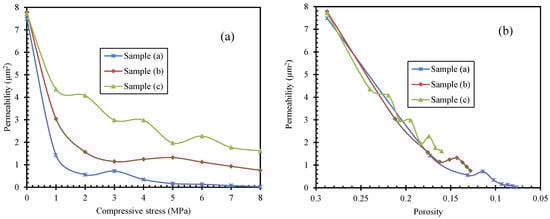 Permeability evolutions for samples (a, b, and c). (a) Permeability–compressive stress curves; and (b) permeability–porosity curves.