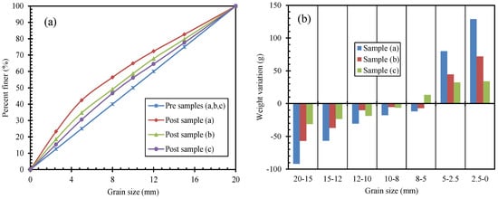 Grain size distributions and weight variation for samples (a, b, and c). (a) Grain size distribution; and (b) weight variation after testing (+ means increased, – means decreased).