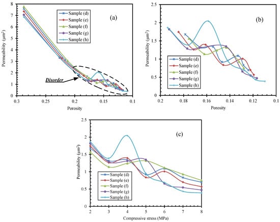 As shown in Figure 8, the permeability under the larger stress rate has higher values due to the sample being subjected to a larger stress rate. This most likely occurs because the compressive stress causes a greater degree of closure of the void space. However, there were some abnormal increases in permeability at the critical compressive stress. As seen in Figure 8, the critical compressive stress for samples (a, b, and c) was 2–3 MPa, 4–5 MPa, and 5–6 MPa, respectively, with a corresponding porosity of 0.13–0.11, 0.15–0.14, and 0.18–0.17. At the critical compressive stress, isolated fractures in the larger grain size sample achieved the transformation from self–extension to inter-connection, which increases the permeability rapidly.