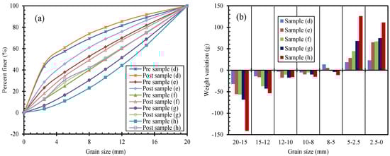 Table 4 shows the typical GSD after testing and their variation is shown in Figure 12, compared with the original GSD (Test 2) in Table 1. The mass of the <5 mm size fraction was increased after compression for each sample. However, the mass of the 20–8 mm size fraction was reduced. During compression, larger grains (e.g., 20–8 mm) were broken into smaller sizes, which caused the mass of the <5 mm size fraction to increase. Furthermore, the 20–15 mm size fraction decreased the most and this was attributed to larger particles being more easily crushed during compression. This is why the critical compressive stress for sample (h) shows a minimum value in Figure 11c. Samples with a higher proportion of larger diameter particles showed a larger decrease in the mass of the 20–12 mm size fraction and an increase in the <5 mm size fraction. The fraction of particles in the 8–5 mm size range increased for samples (d and e), but reduced for samples (f, g, and h).