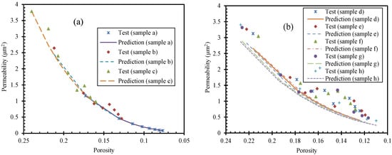 where, is the initial porosity and is the initial permeability. The test and predictive data of permeability were shown in Figure 13. A simple statistical efficiency criterion was used to analyze the model performance in Equation (15), based on the coefficient of determination factor R2: