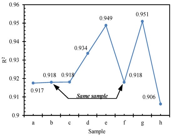 where l is the total number of test data, l = 9; is the experimentally tested value, and is the model prediction associated with a test. The results of the R2 values for different test samples are shown in Figure 14.