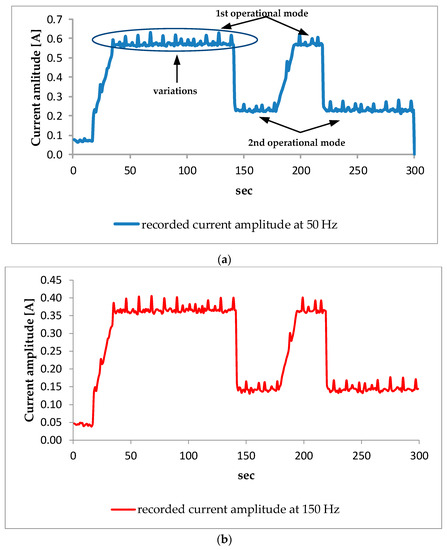 In Figure 2a–c the recorded current values for the vacuum appliance are presented for the 3 examined frequencies. In this case one operational mode exists that is relatively constant with very smooth variations. Thus, the LS could be formed based on few values for each frequency that would be representative for the whole steady state operation period.