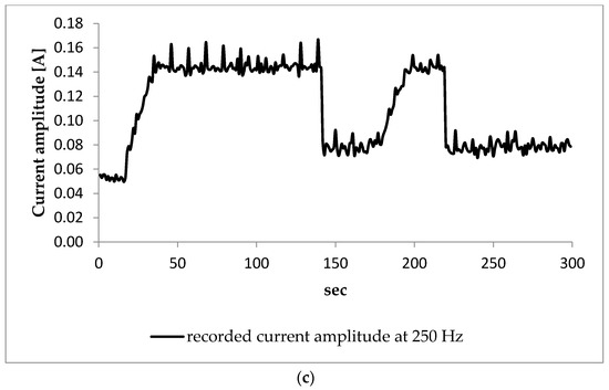 (a) Recorded current amplitudes for vacuum appliance for 50 Hz; (b) Recorded current amplitudes for vacuum appliance for 150 Hz; (c) Recorded current amplitudes for vacuum appliance for 250 Hz.