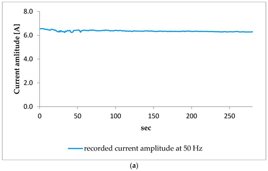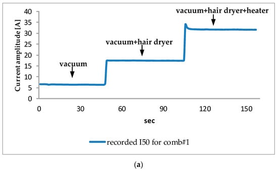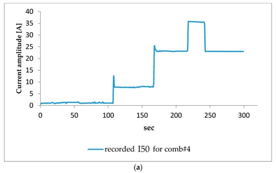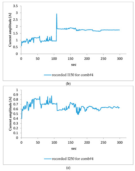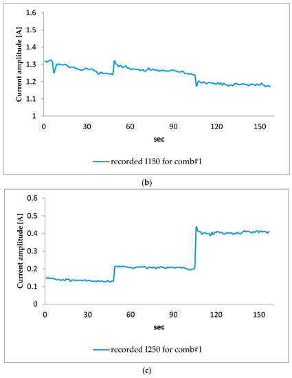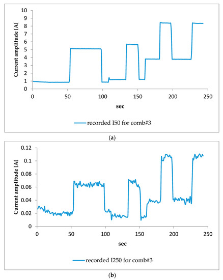 In Figure 7a,b and Figure 8a–c the recorded current values for comb#3 and comb#4 are also presented. It should be clarified that for comb#3 the recorded current values for the 3rd harmonic order was negligible.