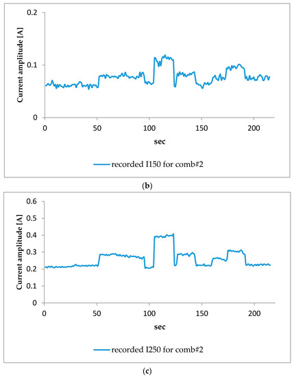(a) Recorded current values I50 for comb#2; (b) Recorded current values I150 for comb#2; (c) Recorded current values I250 for comb#2.