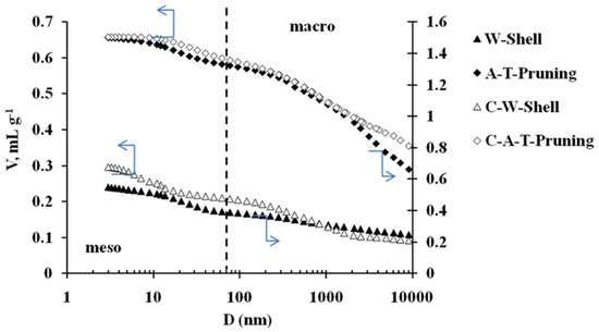 As it can be deduced from Table 2, the porosity (%) of the residues seems to influence the one found in the char. On the other hand, from Figure 1 it can be seen that the carbonization process gives rise to a great development of meso and macroporosity. Also, this development maintains to a certain extent the meso-macro distribution of the parent material; which can be observed from both Table 2 (see the ratio VmeP/VmaP) and Figure 1, where the shape of the curves in the lower pore size region indicates that WS presents a higher volume of narrow mesopores while they are almost negligible in the case of ATP. As it can be observed, this trend is also found after carbonization. The precursor composition might also have an effect on the pore development of the char after pyrolyisis. Previous studies have reported that porosity formation might be favored for materials with a high content on hemicellulose and cellulose, since these are the components degraded upon pyrolyisis. Upon devolatilization, oxygen and hydrogen are removed leaving behind a higher concentration of carbon in the char. Dissimilarly, lignin can be degraded in a wider temperature range, and its more resistant fractions need higher temperatures to be fully decomposed (up to 850 °C) [14,15].