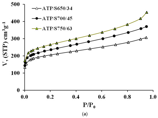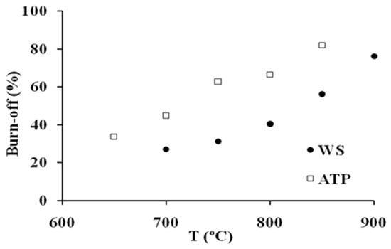 From Figure 3 and Figure 4 it can be seen that all isotherms are of type I [17], typical of microporous materials. However, a difference can be highlighted from the shape of the isotherms of the different precursors; while the isotherms of WS series have a low slope in the multilayer region (and thus, a low contribution of mesoporosity), the ATP curves show a continuous increase along all the relative pressure interval, which indicates a wider microporosity and a higher contribution of external area. This effect gets more evident for greater burn-off values. Moreover, the greater reactivity shown by ATP upon pyrolysis is found again for activation processes. In all cases, similar activation conditions yield a greater burn-off degree for this material, which definitely will influence the porosity development, as shown below.
