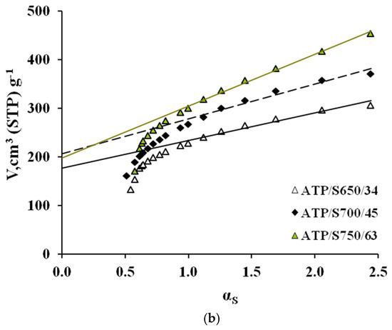 The AC N2 adsorption isotherms (a) and corresponding α-plots (b) are shown in Figure 3 and Figure 4, respectively. In these Figures, the ACs have been denoted according to the following nomenclature PR/ST/b, where PR represents the precursor, S means steam, used as activating agent in both series, T stands for activation temperature, and b means the burn-off degree attained in each case. Typical parameters determined from N2 adsorption data are collected in Table 4.