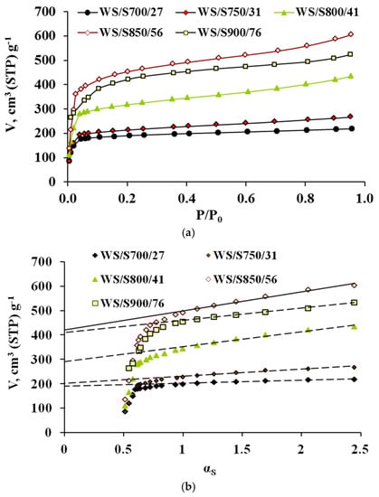 (a) N2 adsorption isotherms at 77 K and (b) corresponding alfa plots of ACs prepared from WS.