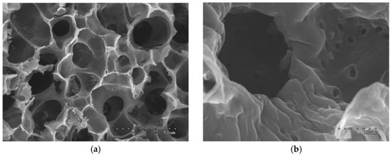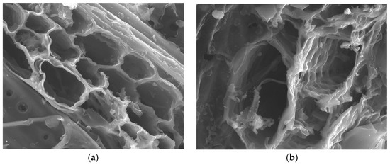 SEM micrographs of almond pruning AC (ATP/S750/63). Magnification: (a) 1500 and (b) 8000.