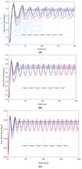 As shown in Figure 9, when the operating condition of the stationary CNG engine is constant, the fluctuation of refrigerant mass flow rate increases with the decrease of expander speed (from case 1 to case 7), especially in the engine’s low-load regions (from 20% engine load to 40% engine load), the fluctuation is more obvious. The reason can be explained as follows: the engine from start to run in the low-load region, the available exhaust energy rate is relatively low and occasionally undulates seriously which leads to the fluctuation of refrigerant mass flow rate. On the other hand, because the precise and complicated control strategy are not applied to the ORC system, the dynamic matching characteristics between refrigerant mass flow rate and expander speed is gradually degraded with the decrease of engine load. As shown in Figure 9a,e, the refrigerant mass flow rate is always keeping stable in the seven cases of 100% engine load. Whereas, the refrigerant mass flow rate is stable only in the case 1 of 20% engine load. According to the analysis, the precise and complicated control strategy should be applied to the ORC system, but this will increase the operation cost of ORC system which affects the engineering application.
