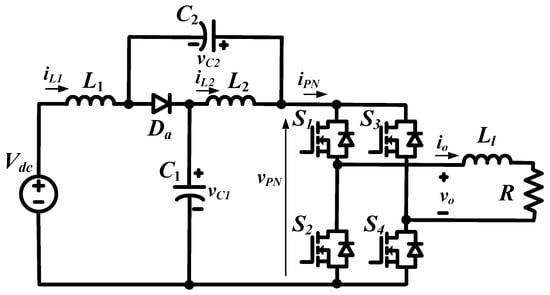 Figure 1 shows the single-phase qZSI [11,12,13]. Compared to ZSI, qZSI improves the input current and reduces the capacitor voltage rating. Like ZSI/qZSIs, switched-boost inverters (SBIs) [20,21,22,23,24,25,26] also use the shoot-through time interval to achieve single-stage power conversion with buck-boost characteristics and improve reliability. In comparison with ZSIs, SBIs use one more active switch and fewer passive components [20]. Thus the size, weight, and cost of power inverters can be decreased. An SBI for standalone DC nanogrid applications is presented in [21]. In the basic SBI topology [22], the input current is discontinuous and its boost factor is lower than that of ZSIs. Quasi-switched boost inverters (qSBIs) [23,24] overcome the shortcomings of conventional SBIs by improving the profile of the input current and reducing the voltage stress of the capacitor. In [25], the concept of a switched inductor is applied to the SBI topologies to improve the boost factor. Compared to conventional SBIs, switched-inductor boost inverters [25] add only three diodes and one inductor to produce a high step-up DC-link voltage. The active switched-capacitor/switched-inductor qZSIs presented in [26] are also based on switched-inductor boost inverter topologies [25].