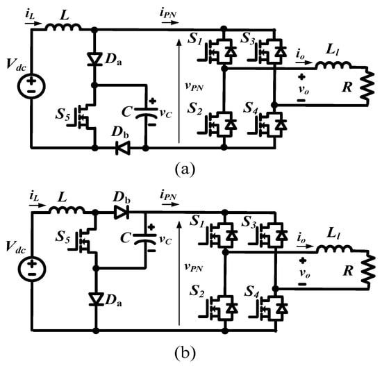 In order to eliminate the undesired operation state as shown in Figure 3c, one simple method is addressed in which Da is replaced by an active switch, S6. The improved configuration of qSBI is shown in Figure 5. S5 and S6 have a common drain in Figure 5a, whereas they have a common source in Figure 5b. The gate signal of S6 is complementary to that of S5. By using this topology, the inverter produces a stable voltage in the DC link during the non-shoot-through state to improve the AC output quality without the aforementioned limitation.