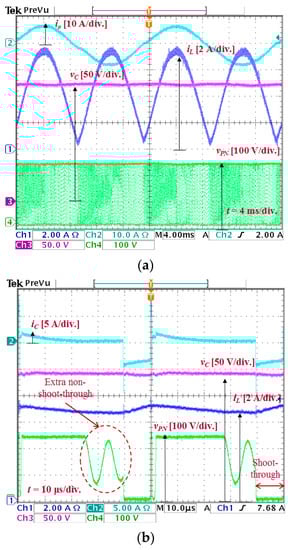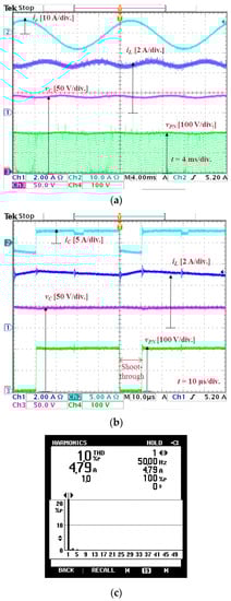 Figure 4 shows the experimental waveforms of the type 2 single-phase qSBI when Vdc = 120 V, D = 0.2, and M = 0.8. The experimental parameters are L = 6 mH, C = 2000 μF, Lf = 5 mH, and R = 20 Ω. As shown in Figure 4b, the DC-link voltage is unstable during the non-shoot-through state when the shoot-through duty cycle is small. The measured THD of the output current is 5.5%.
