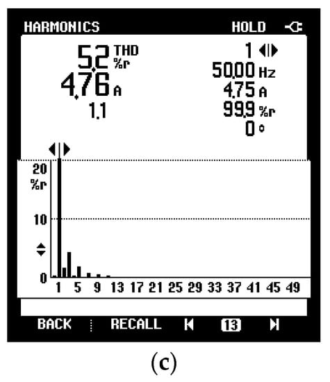 Experimental waveforms for qSBI when Vdc = 120 V, M = 0.8 and A = 0.01. From top to bottom: (a) load current, inductor current, capacitor voltage, DC-link voltage; (b) capacitor current, capacitor voltage, inductor current, DC-link voltage; and (c) load current harmonics.