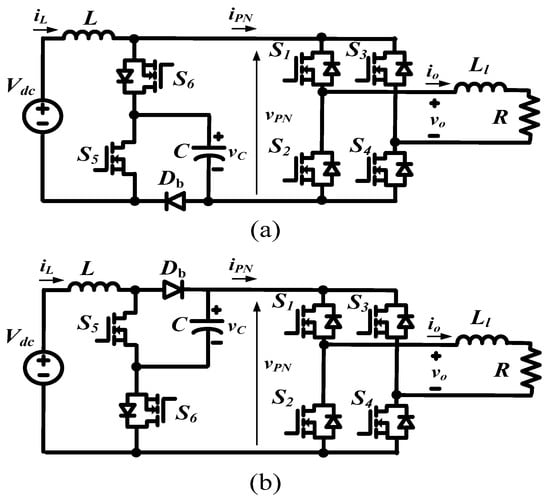 In order to improve the modulation index, a small shoot-through duty cycle is used. Thus, the improved single-phase qSBI as shown in Figure 5 is used to eliminate the undesired operation state of Figure 3c. Because the improved qSBI topology for the type 2 variant as shown in Figure 5b has common-source connected S5 and S6, it is used for analysis and experiment in this paper. The operating states of the improved qSBI are simplified into non-shoot-through and shoot-through states as shown in Figure 3a,b, respectively.