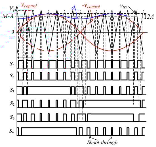 In single-phase qZSIs [8,9,10,11,12,13,14,15,16] and single-phase qSBIs [20,21,22,23,24], a simple boost PWM control method is usually used. In this method, a constant voltage is compared to a triangle waveform to generate a control signal for the shoot-through state. As a result, the maximum duty ratio of the shoot-through state is limited by (1–M) to ensure that the shoot-through interval is only inserted into the traditional zero states. When a large shoot-through duty cycle is used, the modulation index must be reduced. Using a low modulation index reduces the overall DC-to-AC inversion gain and increases the THD value [4].