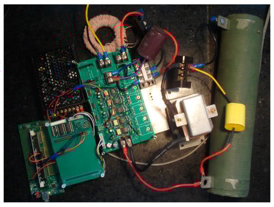 Two 700 W prototypes were used to verify the operating principle of the single-phase improved qSBI in Figure 5b and qZSI in Figure 1. The experimental parameters are listed in Table 1. A 61604 Chroma Programmable AC Source was used to supply the DC input voltage of 120 V. Power MOSFETs IRFP460 (Fairchild, Sunnyvale, CA, USA) and power diode DSEP30-06A (Ixys, Milpitas, CA, USA) were used. The PWM control signals for power switches were generated from a TMS320F28335 DSP (Texas Instruments, Dallas, TX, USA). Logic OR gates were used to insert the shoot-through state into switches S1 to S4. The switches were driven by isolated amplifiers (TLP250, Toshiba, Tokyo, Japan). Figure 7 shows an experimental prototype in the laboratory.
