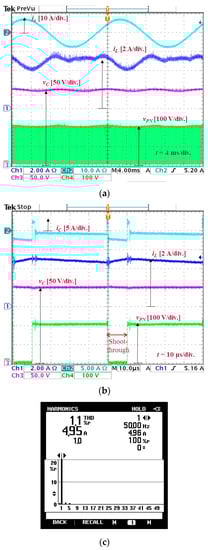 Next, small signal perturbation with a frequency of 100 Hz was injected into the shoot-through duty cycle. Figure 9 shows the experimental results for the improved SBI when M = 0.8 and A = 0.01. The shoot-through duty cycle calculated using Equation (6) was 0.21. The measured DC-link voltage is 200 V, which was close to the calculated value of 207 V when D = 0.21. The measured RMS output current and its THD were 5 A and 1.1%, respectively.