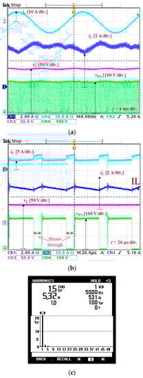 Then, the inverter was reconfigured as per the single-phase qZSI to test the proposed PWM strategy. Figure 10 shows the experimental results for the qZSI when M = 0.75 and A = 0.01. The calculated shoot-through duty cycle was 0.26. The measured DC-link voltage was 240 V, which was close to the calculated value of 250 V when D = 0.26. The measured RMS output current and its THD were 5.32 A and 1.5%, respectively.