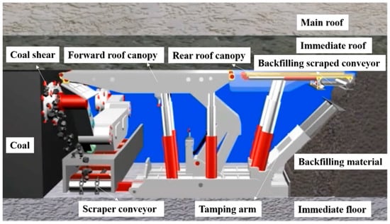 The backfill hydraulic supports [21,22] are key to the success of solid backfilling. As shown in Figure 1, its front canopy supports the roof, providing a safe space to operate mining machines, and its back canopy offers the space required to transport the backfill material, and to dump and compact it in the gob. The backfilling scraper conveyor, used for transporting the solid backfill materials, is hung below the rear roof canopy. Another important piece of equipment in the rear part of the backfill hydraulic support is the tamping arm, which can provide a pressure of 2 MPa to push the backfill materials into the gob and compact them to a sufficient density to effectively support the roof [11].