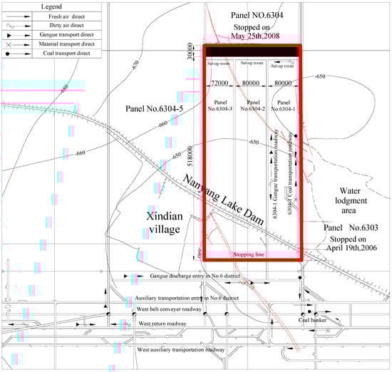 Backfill coal mining technology has been applied in Panel No. 6304-1 of the Jisan coal mine, where the No. 3 coal seam of the Shanxi formation is the main mineable coal seam. The average thickness of the No. 3 coal seam is 3.5 m, its average dip is 2.5°, its density is 1.36 t/m3, and its average depth is 650 m. It has no immediate roof. The main roof is a fine sandstone of 32.5–49.75 m thick (with an average thickness of 41.6 m), the uniaxial compressive strength is 84.4 MPa, the tensile strength is 13.5 MPa, and the elastic modulus is 17.0 GPa. It can be regarded as a hard roof. The panel, No. 6304, was divided into three working faces, with a face length of 80 m and advancing distance of 518 m. The physical simulation experiment was mainly based on the specific conditions of Panel No. 6304-1, whose working face layout is shown in Figure 2.