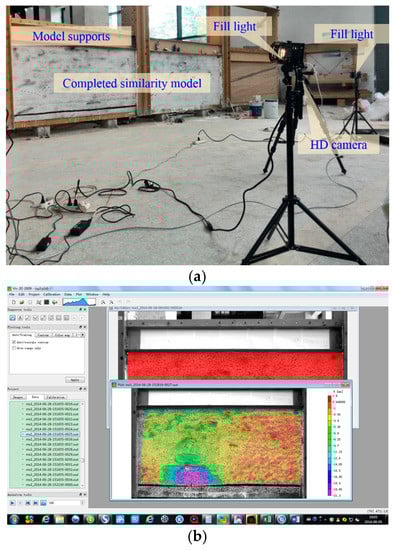 Model supports measuring 2.30 m × 0.30 m × 1.80 m were used to perform the experiments, with pressure water bags used as the compensatory loads. Changes in the abutment stress ahead of the working face were monitored using pressure sensors arranged inside the coal seam and a TS3890 static strain indicator (Yangzhou Thai Electronics Co., Ltd., Yangzhou, China). A non-contact strain measurement system was used to monitor displacement variations in the overlying strata. The system used an advanced 2D digital image correlation algorithm, which can measure arbitrary displacement and deformation from 500 micro strain to more than five times strain. The size of the observed model is from 1 mm to 10 m. This monitoring system uses an industrial digital camera (29 million pixels), optical lens, lighting, matching notebook, Flycapture software, and Vic-2D (Beijing Deanwell Technology Co., Ltd., Beijing, China). The Flycapture software relies on the Canadian PointGrey industrial digital camera. Vic-2D can realize the data-output constantly and deal with the data. The arrangement of the measurement and data processing systems is shown in Figure 3.