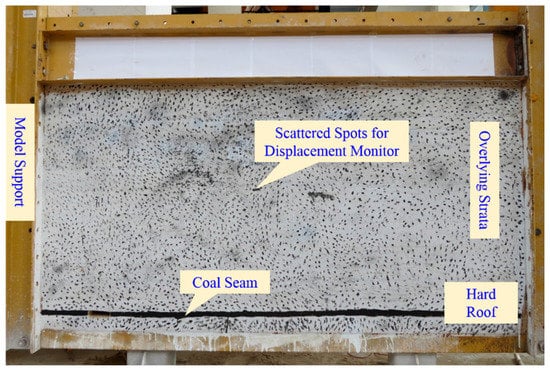 The rock masses in the models were laid from bottom to top. Before the placement of each stratum, sand, calcium carbonate, plaster, and water were mixed in a blender with the mass of each component as shown in Table 2. After mixing, the materials were spread evenly and smoothly on the model support and tamped by a special hammer to create the appropriate stratum height. Next, a layer of mica plate with a thickness not more than 1 mm was laid evenly over the stratum before the placement of the next stratum. Once completed, the surface of the model was monitored by the speckle, as shown in Figure 4. The model is laid on the model support which can provide boundary constraints, and the model can simulate the movement and deformation of the coal seam, hard roof, and overlying strata.