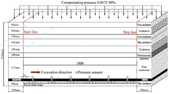 Each model was designed to consist of nine strata including the coal seam, hard roof, immediate roof, and partially overlying strata. The model size was 2.30 m × 0.30 m × 1.23 m (L × W × H). The real height on site was 184.80 m. The rock strata that were not laid were approximately 475 m thick. According to the stress similarity ratio, a compensatory load of 0.0475 MPa was required, which was applied using pressure water bags.