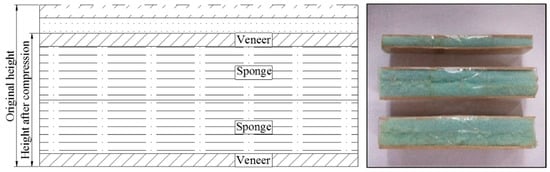 To precisely simulate the roof deformation and stress changes of the face during solid backfill coal mining, it was necessary to design a suitable solid backfill analog that had a similar strain–stress relationship to that of the actual solid backfill body. Based on past test experiences, sponges and plain paper were used as the solid backfill analog. Tests have revealed that after the sponge is pre-compressed, its strain–stress curve is closest to that of an actual solid backfill body. The sponge was therefore pre-compressed by veneers and Scotch tape and fixed at an appropriate height, as shown in Figure 7.