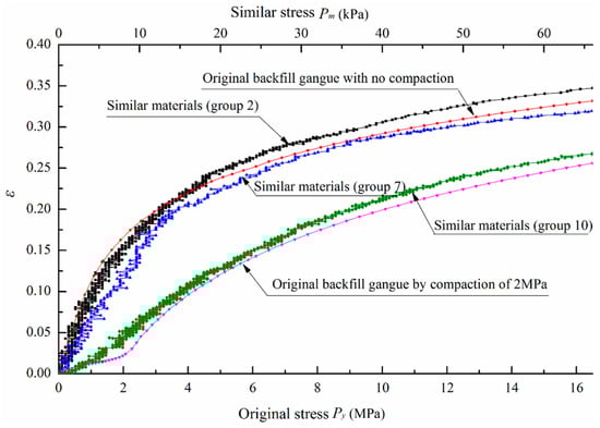 An MTS electro-hydraulic servo tester (MTS Systems Co., Eden Prairie, MN, USA) was used to perform uniaxial compression tests on each group. The strain–stress curve of each group was obtained by providing stress loading ranging from 0 kPa to 66 kPa (similar pressure stress to 16.5 MPa). Comparisons to the strain–stress curves of the coal gangue mentioned in Section 3.1 indicate that the strain–stress curves of groups 2, 7 and 10 were the closest. Therefore, those groups were used as solid backfill analogs for the scenarios with roof-controlled backfilling ratios of 40%, 82.5%, and 97%. Figure 8 displays the results of the strain–stress curves for comparison.