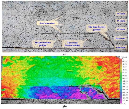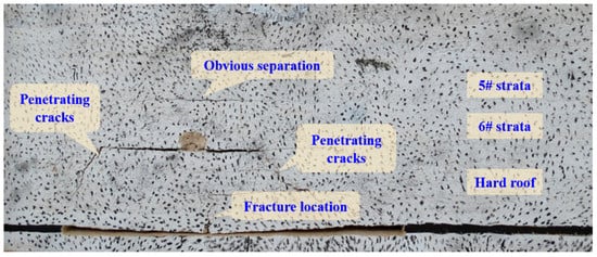 - When the mining reached a distance of 127.5 m, obvious separation was observed between the hard roof and the No. 6 stratum—mudstone and sandstone interbedding; the maximum displacement in the vertical direction was 0.29 m. At a distance of 67 m from the start line, a crack about 14 m high occurred at the lower part of the hard roof. The crack did not penetrate through the roof.