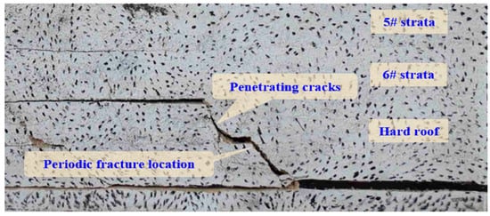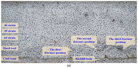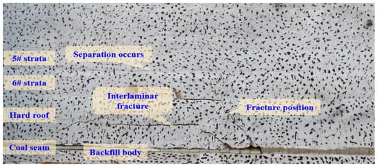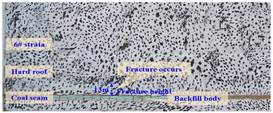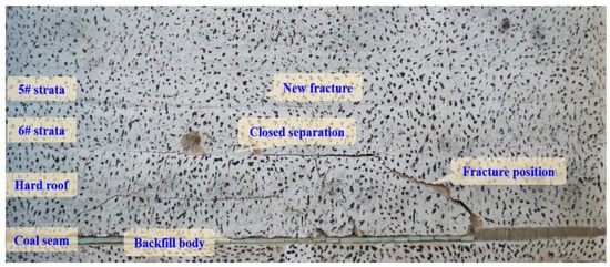 - When the mining reached a distance of 225 m, the hard roof experienced a periodic fracture, with a fracture interval of 60 m. The fractured roof weighed completely on the backfill body, and penetrating cracks occurred above the working face. At this time, the separations and cracks above the middle of the mined-out area gradually closed. The No. 6 stratum displayed vertical penetrating cracks and was separated from the No. 5 stratum, which also subsided by a maximum amount of 1.5 m, as shown in Figure 13.