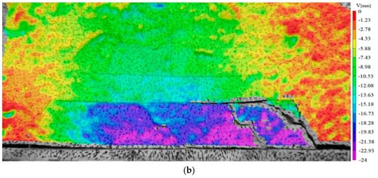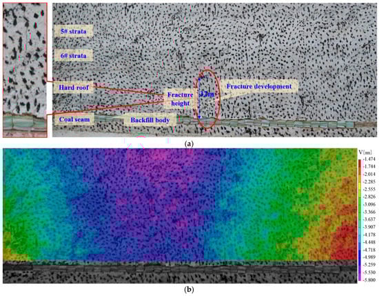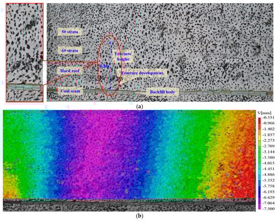 Figure 16. Deformation and displacement distribution cloud graph of overlying strata when the mining had advanced to 270 m with a roof-controlled backfilling ratio of 82.5%. (a) Deformation of overlying strata; (b) Displacement distribution cloud graph of overlying strata.