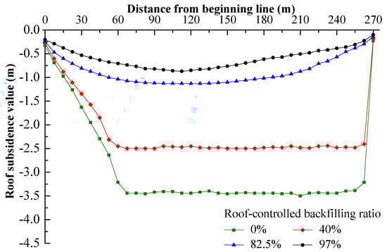 Deformation characteristics of the hard roof were summarized, compared, and analyzed based on the four groups of experiments with different roof-controlled backfilling ratios. The results are shown in Table 4. At the bottom of the roof, 37 evenly spaced points were selected to obtain the final roof subsidence curves after the completion of mining in each scenario. These curves are displayed in Figure 18.