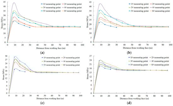 During mining in the four scenarios, the data from the pressure sensors in the coal seam were recorded. The stable values from each mining and backfilling cycle were used to derive distribution curves of the abutment stress ahead of the face for different backfilling ratios. The results are shown in Figure 19 and in Table 5.