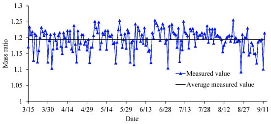 Based on monitoring data of the amount of backfilled waste rock and coal mined during the period from 15 March 2011 to 15 September 2011, the mass ratio of backfilled to mined coal of Panel No. 6304-1 is shown in Figure 19.