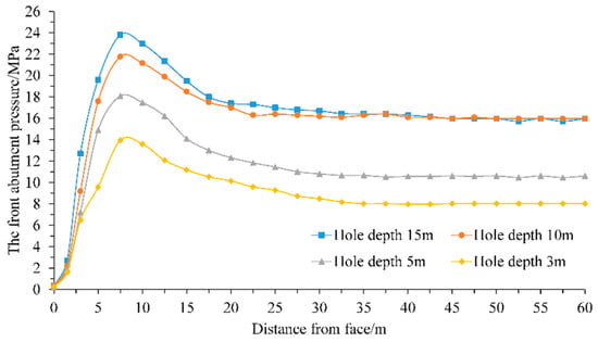 Three monitoring stations were deployed in both the maingate and tailgate of Panel No. 6304-1. At each monitoring point, four different drill hole depths (i.e., 3 m, 5 m, 10 m, and 15 m) were designed with a total of 24 borehole stress meters in total. Taking the measurements of the station 120 m from the setup room as an example, the front abutment pressure in the coal block at different depths is shown in Figure 22 [11].