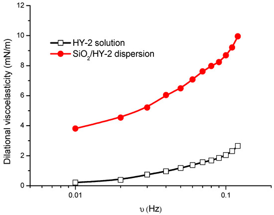 Relationship of dilational viscoelasticity with the frequency of different systems at 30 °C: 0.5 wt % HY-2 solution/N2 interface and 1.0 wt % SiO2 nanoparticles with 0.5 wt % HY-2 aqueous dispersion/N2 interface.