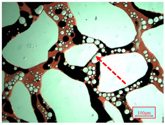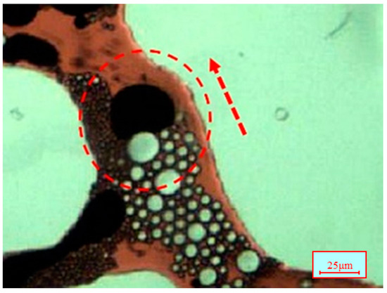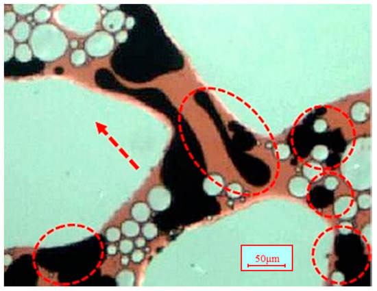 As the trapped oil droplets are pushed into the pores, the flowing gas bubbles can pull the oil droplet into oil threads (see Figure 26). It can be observed in Figure 27 that the residual oil droplet at the interchange of the pores can be pulled into an oil thread. This is also due to the viscoelasticity of the bubbles. The deformation of gas bubbles will occur when in contact with the trapped oil droplets. Later on, bubbles can recover their spherical shape, which will produce an elastic force (Fe) acting on the oil droplet, as shown in Figure 11. The elastic forces can change the shape of the oil droplet and mobilize it (see Figure 28 and Figure 29). As a result, the residual oil droplets could be pulled into oil threads. Therefore, the residual oil can be recovered by nanoparticle-surfactant-stabilized foam flooding, and a greater improvement in the displacement efficiency can be obtained.