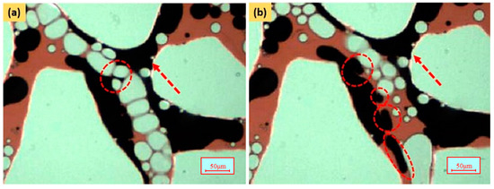 Pore-level images of the formation of oil threads in the interchange of pores. (a) 0.148 PV; (b) 0.159 PV.