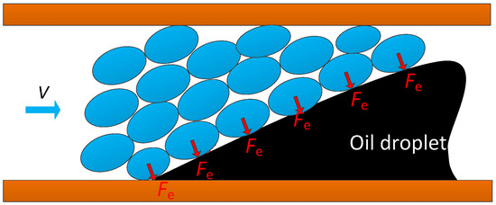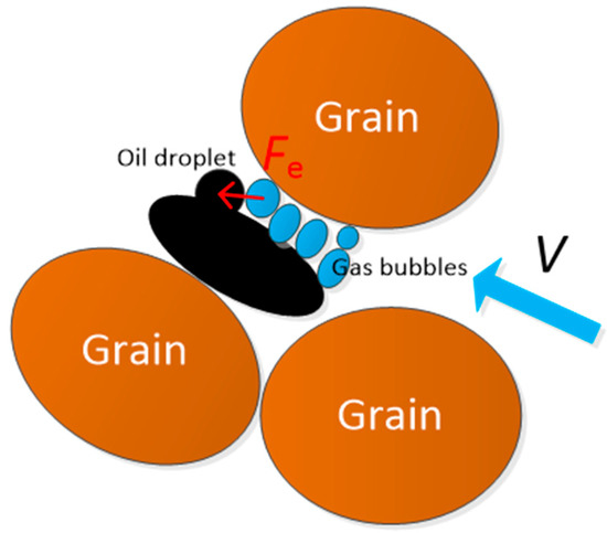 It is clearly observed in Figure 10 that many oil droplets could be stripped and dispersed in porous media because of the emulsification effect of the nanoparticle-surfactant dispersion. In addition, we observed that the flowing gas bubbles can accelerate the formation of emulsified oil droplets (Figure 11). This acceleration can occur because the gas bubbles prefer to remain spherical due to the adsorption of the nanoparticles and surfactant at the water-gas interface [22]. These bubbles will deform when in contact with an oil droplet, as shown in Figure 11a. As shown in Figure 4, the nanoparticles can improve the dilational viscoelasticity of a bubble film. Because of the high viscoelasticity, bubbles tend to recover their spherical shape, which results in the production of a micro-elastic force (Fe) acting on the oil droplet (see Figure 12). The micro-elastic force is helpful for stripping the oil droplets. Therefore, several oil droplets are formed under the action of gas bubbles (see Figure 11b).