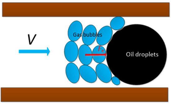 Pore-bridging consists of several gas bubbles or oil droplets in the pore-throats. Taking as an example the bridge-plugging of two gas bubbles, the main forces acting on the gas bubbles include the driving force of the fluid (Fdf), the supportive force of the pore-throat walls (Fs), and the extruding force (Fex) between the bubbles (see Figure 21). The bridge-plugging is clearly affected by the pore-throat size, gas bubble size, bubble viscoelasticity, the quantity of bubbles in the bridges, and the degree of compaction of the bubbles. The supportive force (Fs) and the extruding force (Fex) are both related to the bubble viscoelasticity. The results show that the ability of bridge-plugging increases with an increase in the bubble viscoelasticity.