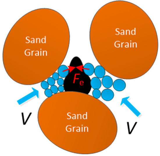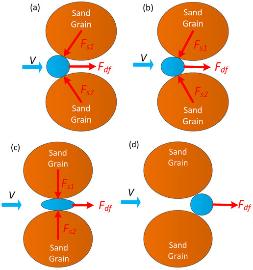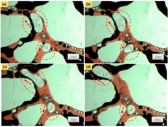 As shown in Figure 18, it is possible for the gas bubble to pass through the pore-throat after capture. It depends on the viscoelasticity of the gas bubble and the difference of the fluid pressure. In Figure 18a, gas bubbles 1 and 2 are captured by the pore-throats. Gas bubble 1 deforms and gradually enters the pore-throat. This is because the driving force of the fluid (Fdf) on the gas bubble is high enough to overcome the supportive force of the pore-throat walls (Fs) (see Figure 19a). Then, the gas bubble transforms and flows in the pore-throat (see Figure 18c). After the gas bubble passes through the pore-throat, it will quickly regain its original shape and size (see Figure 18d). The forces acting on the gas bubbles while they remigrate in the pore-throats are shown in Figure 19. However, gas bubble 2 cannot remigrate into the pore-throat because the difference in fluid pressure is not high enough to overcome the supportive force.