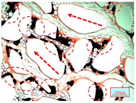 Water is a Newtonian fluid and during the process of water flooding, it can only push the oil along the displacement front, which leaves a large number of residual oil droplets beside the streamline (see Figure 23). For the nanoparticle-surfactant-stabilized foam flooding, the elastic forces of the gas bubbles will act on the residual oil droplets due to the high viscoelasticity of the gas bubbles (see Figure 24). Therefore, the trapped oil droplets will gradually be pushed into the pores by gas bubbles, as shown in Figure 25.